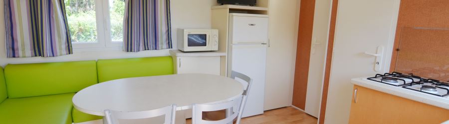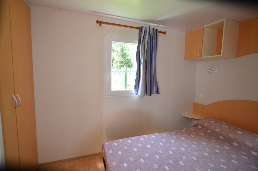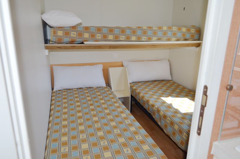 Disponemos de 5 mobil-home con dos habitaciones, una con cama de matrimonio y otra co 3 camas de 80 cm. lo que lo hace ideal para 4 o 5 personas. Todos tienen además cocina con menaje, baño separado de la ducha, utensilios básicos de cocina. Porche exterior cubierto con muebles de jardín y parcela individual de césped con parking para tu coche.