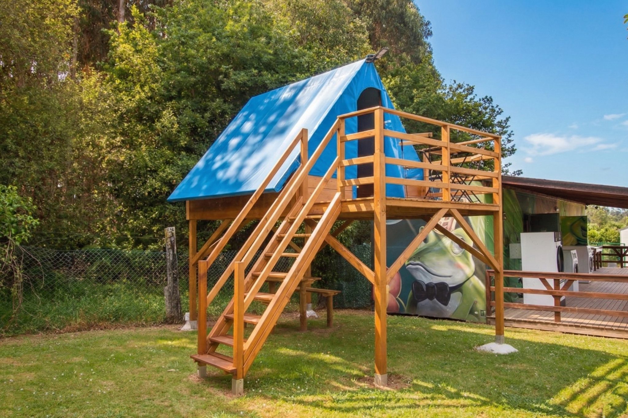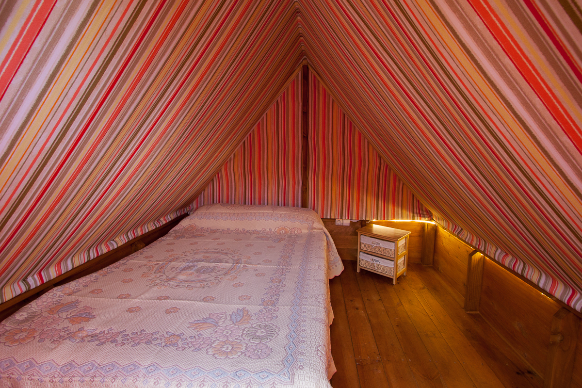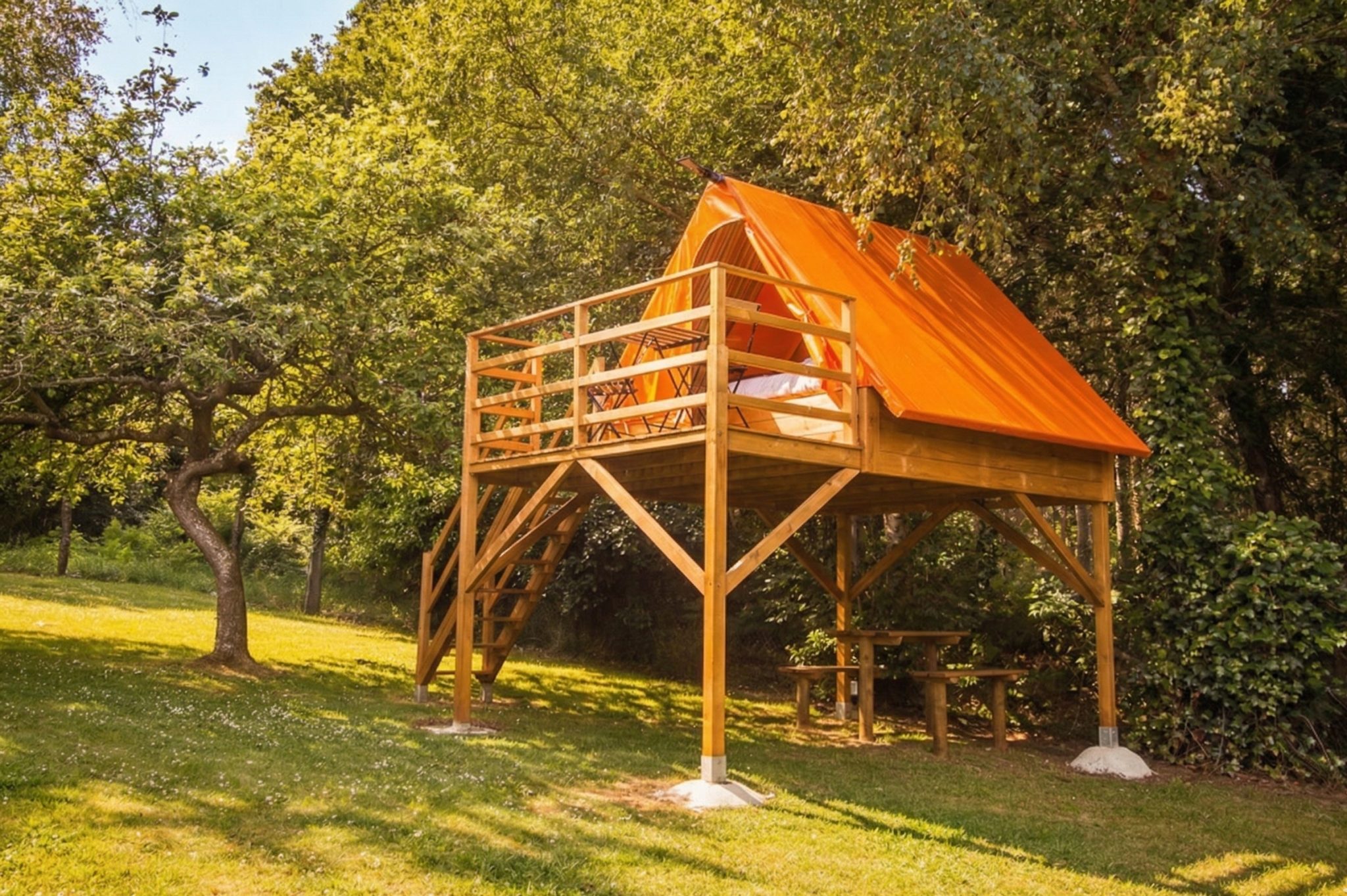 Tiendas elevadas tipo glamping, con cama matrimonial, menaje de cocina y dos terrazas, para que disfrutes del camping en una tienda confortable.